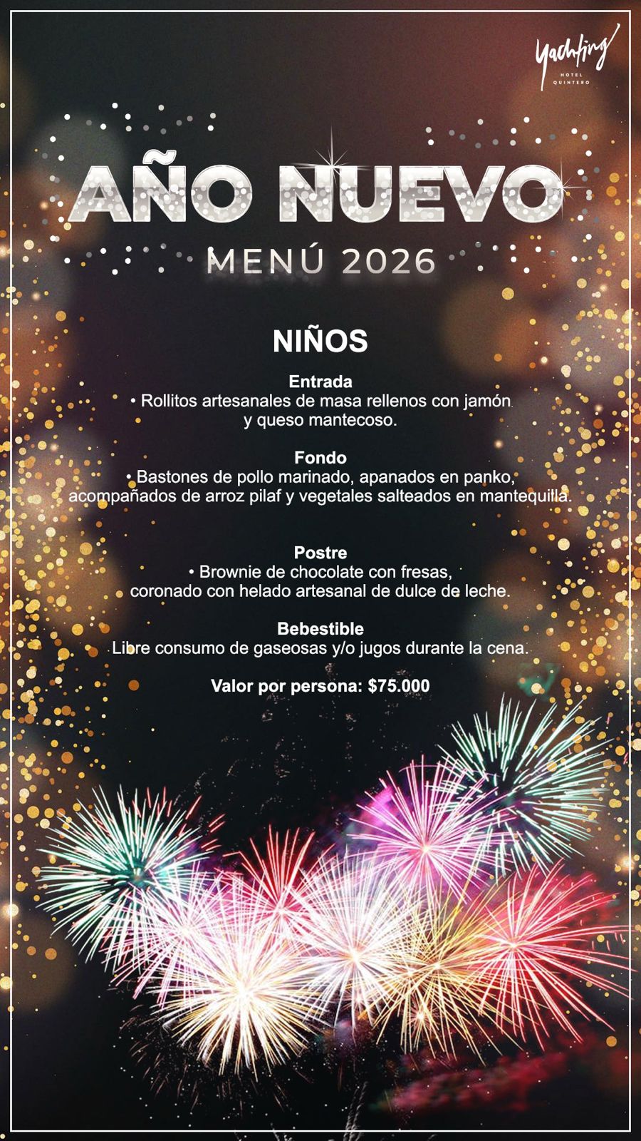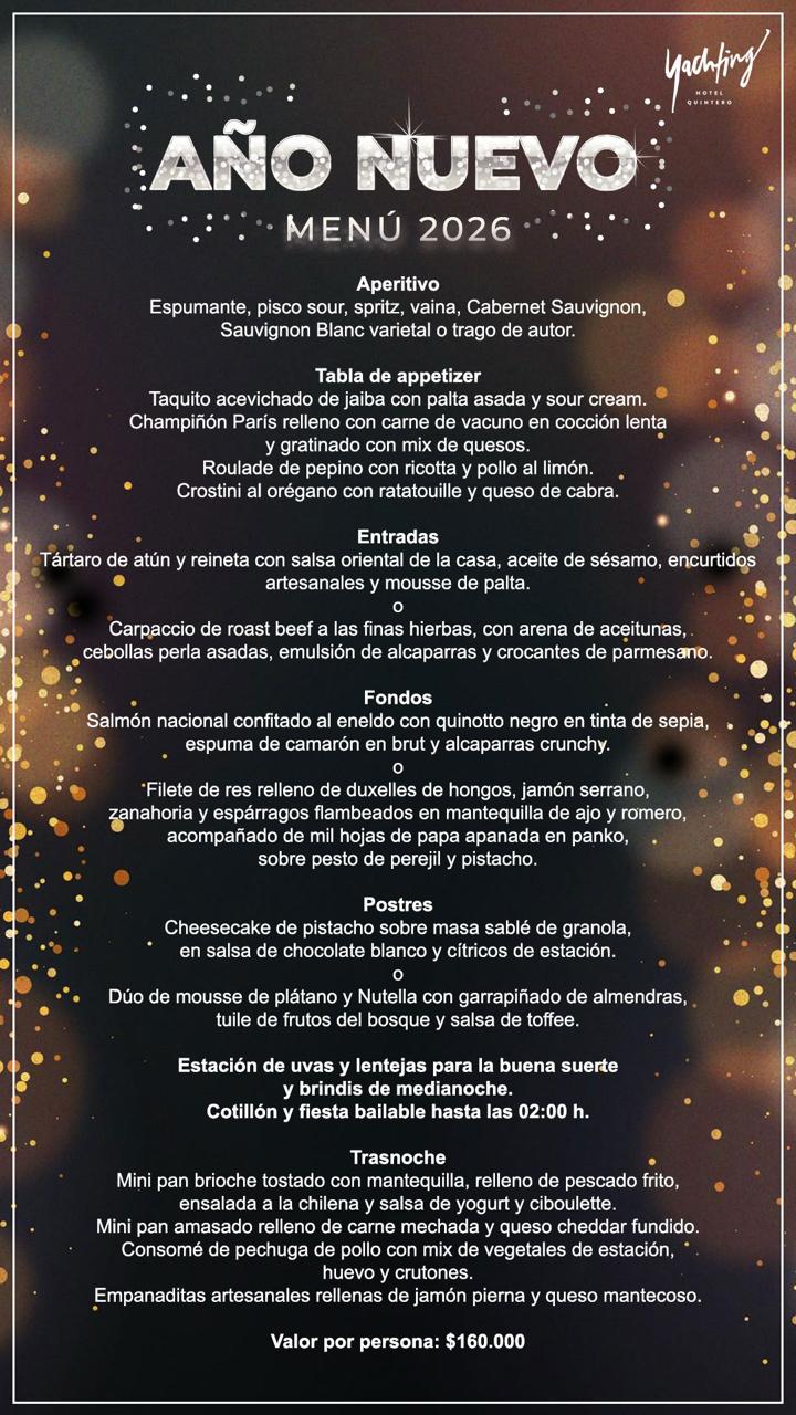 Celebra el Año Nuevo 2026 en Yachting Hotel Quintero ✨ Te invitamos a despedir el año 2025 frente a una imponente vista al Océano Pacífico y dar la bienvenida al 2026 con una gran cena especial y una entretenida fiesta familiar llena de energía y buenos momentos.